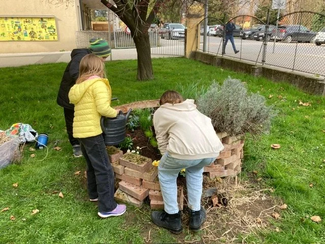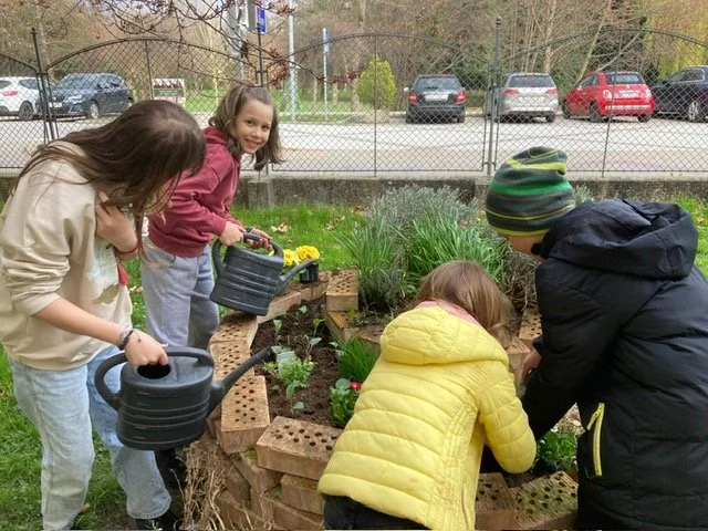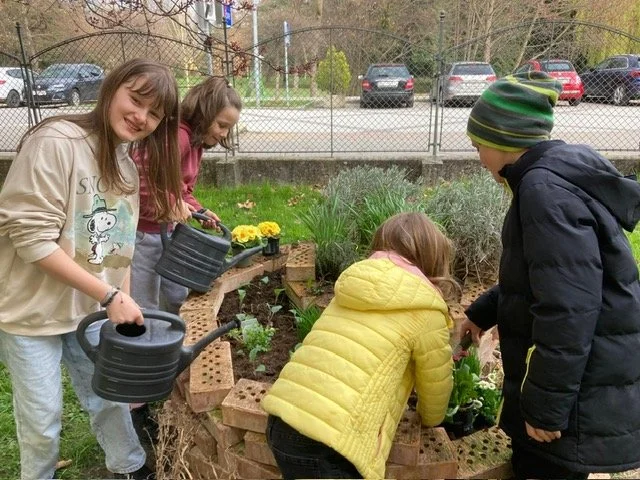 Die Kinder der GTS sind mit großem Interesse und Eifer beim Bepflanzen der Kräuterspirale dabei.