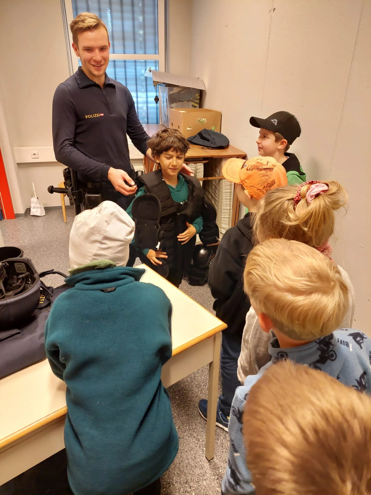 Die 3. Klassen durften heute die Polizeistation Gratwein-Straßengel besuchen. Es war sehr interessant. Zuerst erfuhren wir was die Polizei macht, danach zeigte uns der Polizist seine Ausrüstung, die wirklich viel Gewicht hat. Besonders interessant war die Zelle, die sich in der Polizeistation befindet. Die Polizei erinnerte die Kinder daran, wachsam zu sein und niemals zu Fremden einzusteigen oder fremden Personen die Tür zu öffnen. Herzlichen Dank für den heutigen spannenden Tag!