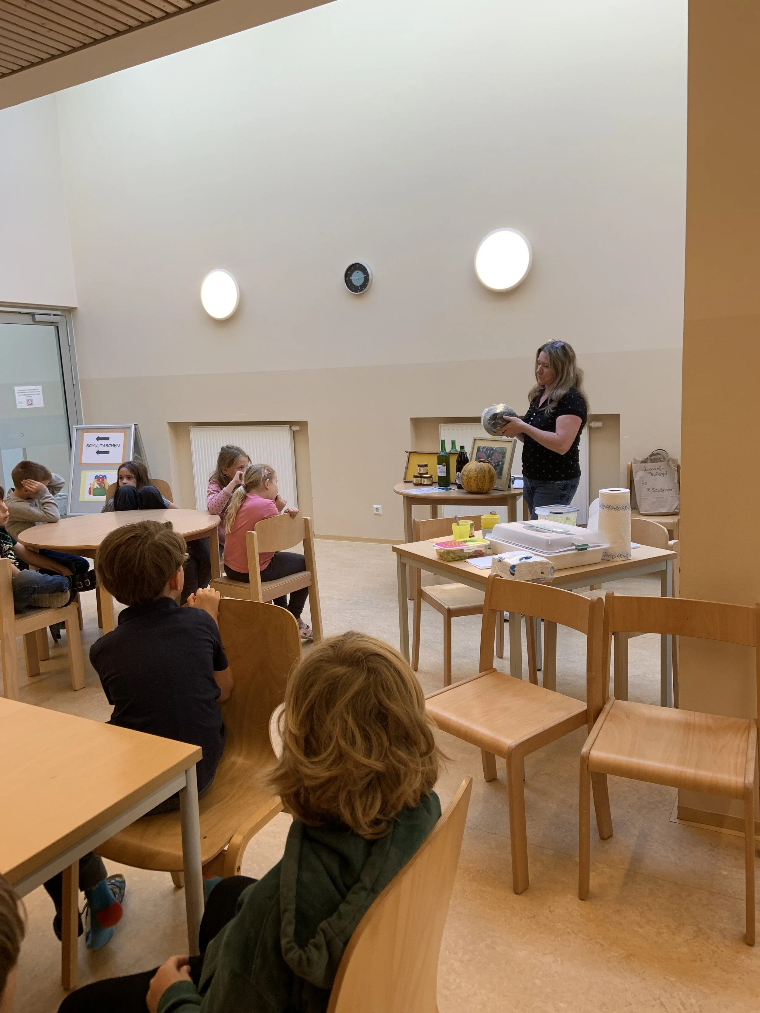 Am 11.10.2023 wurden die zweiten Klassen von einer Bäuerin aus Judendorf-Straßengel besucht. Wir lernten viel über den Anbau und das Ernten von Kürbissen. Auch wurde uns erklärt, wie man erkennt, ob Produkte aus Österreich stammen und welche Gütesiegel es gibt. Das Highlight war natürlich, dass wir selbst gemachten Apfelsaft, selbst gemachtes Brot und Aufstriche verkosten durften.