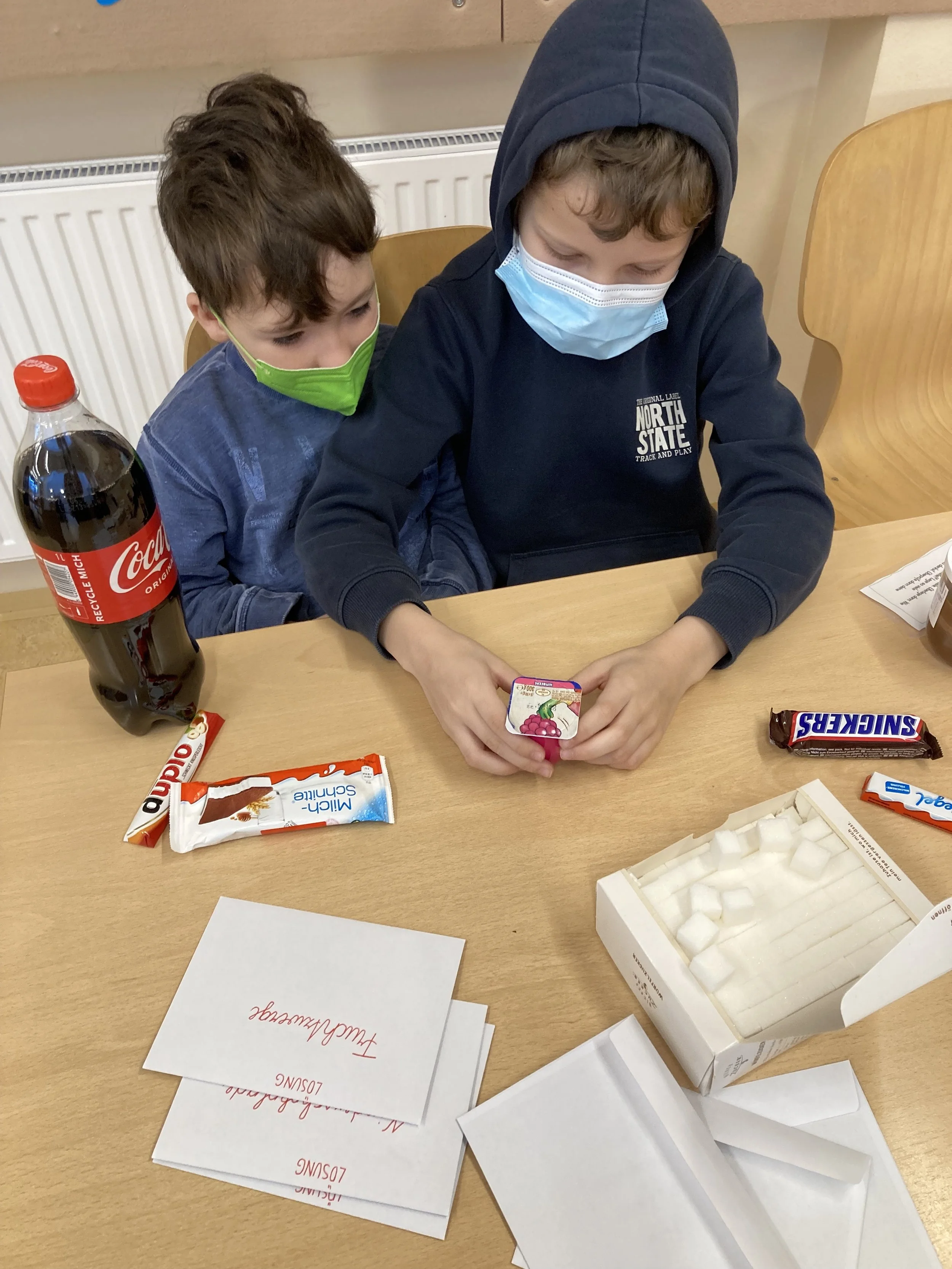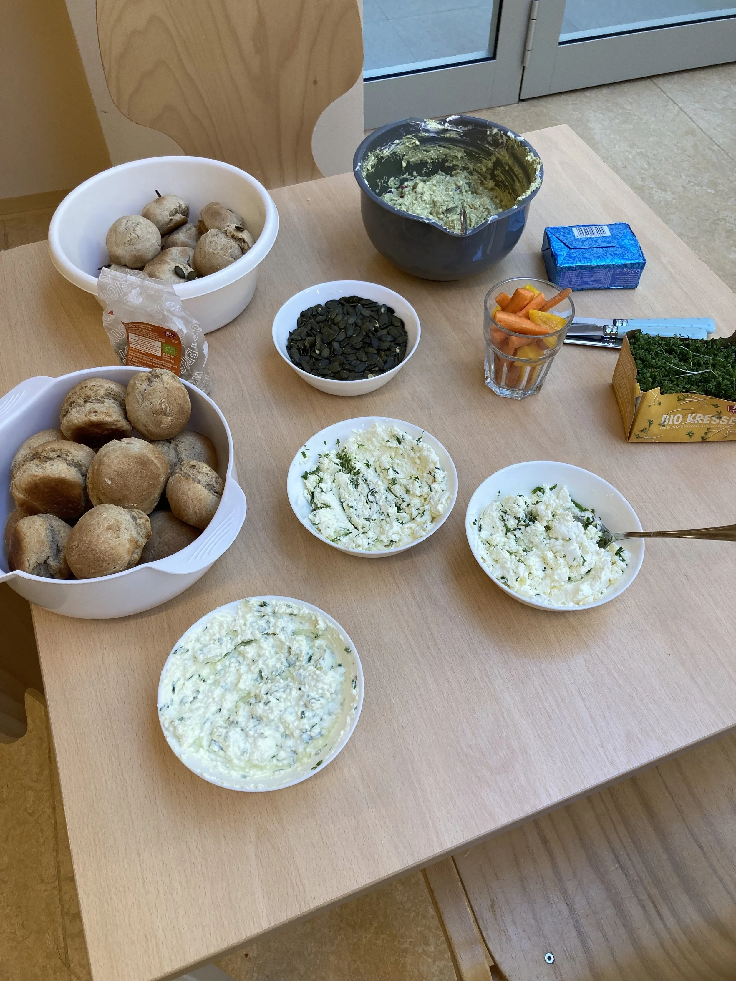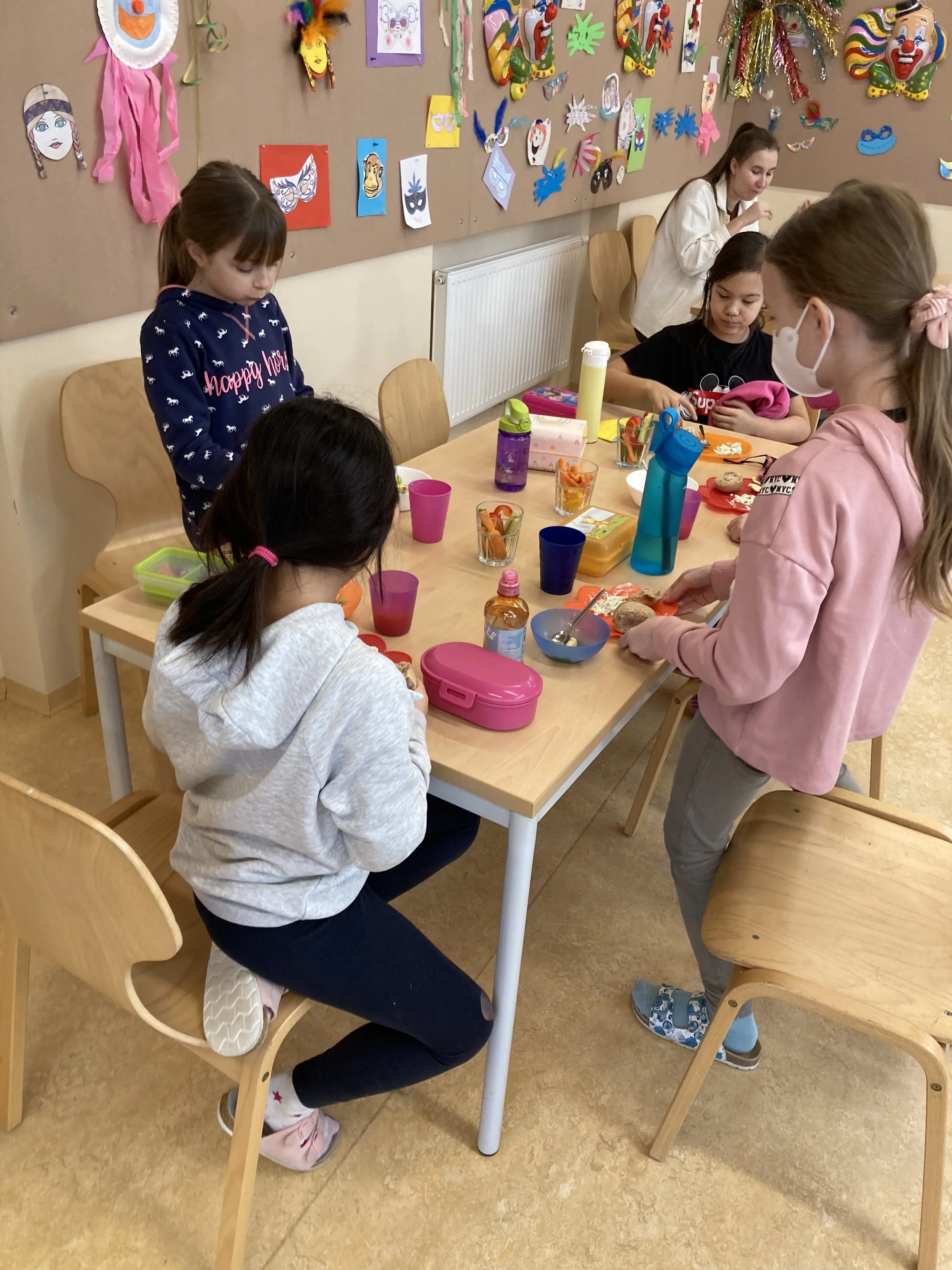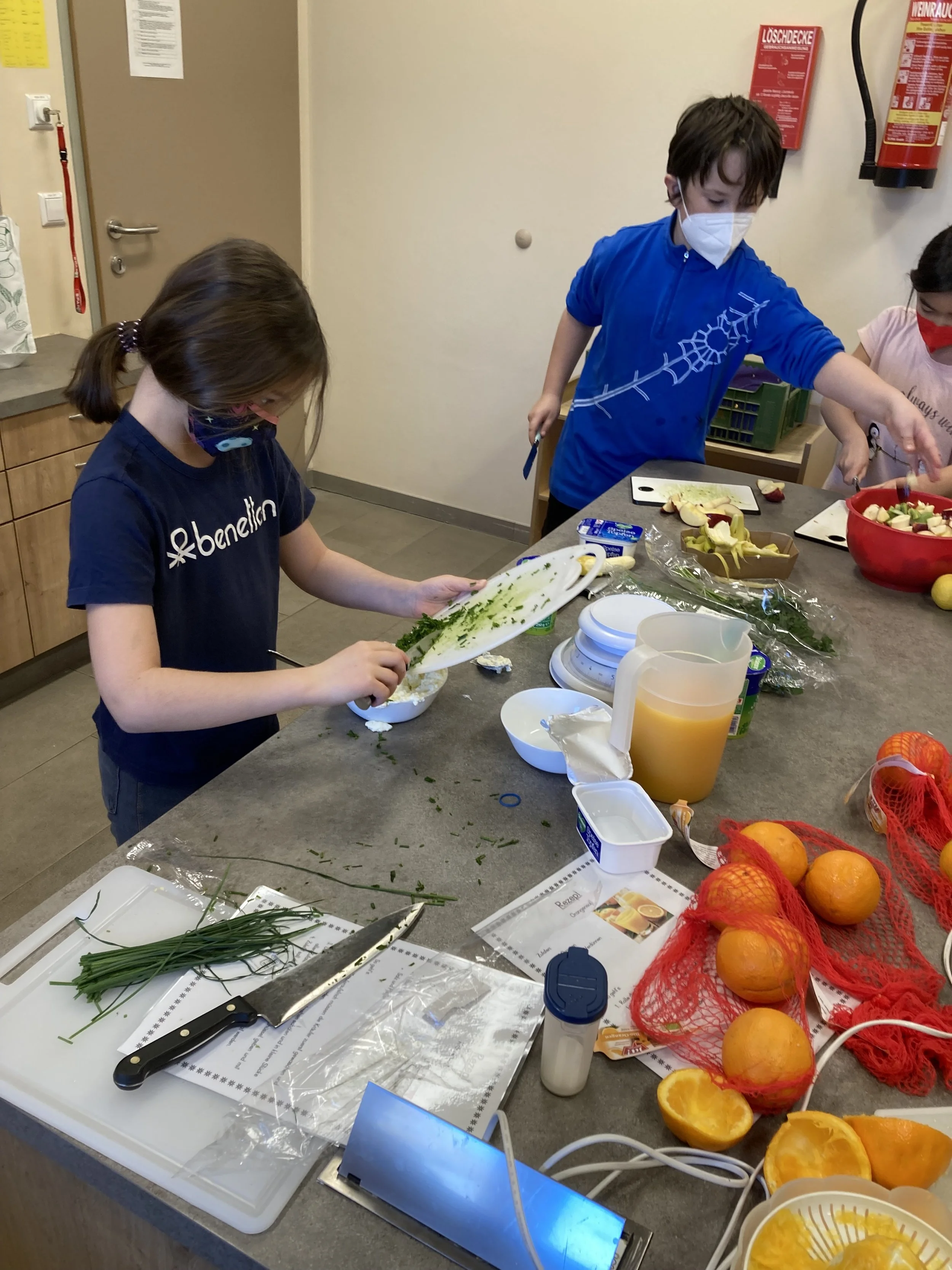 Den krönenden Abschluss unserer Studentinnen bildete das gemeinsame Zubereiten eines gesunden Frühstücks. Wir haben Gemüsesticks und einen Kräuter- und Kürbisaufstrich zubereitet. Zusammen haben wir auch noch leckere Vollkornweckerl gebacken. Als Nachtisch gab es dann noch einen leckeren Obstsalat und frisch gepressten Orangensaft. Zusätzlich hat sich die 3 A Klasse mit der Ernährungspyramide auseinandergesetzt und wir haben unterschiedliche Lebensmittel auf deren Zuckergehalt untersucht. Auf diesem Wege möchten wir uns bei unseren beiden tollen Studentinnen für die vielen abwechslungsreichen Stunden, die sie für uns geplant haben, bedanken! Ihr wart großartig!