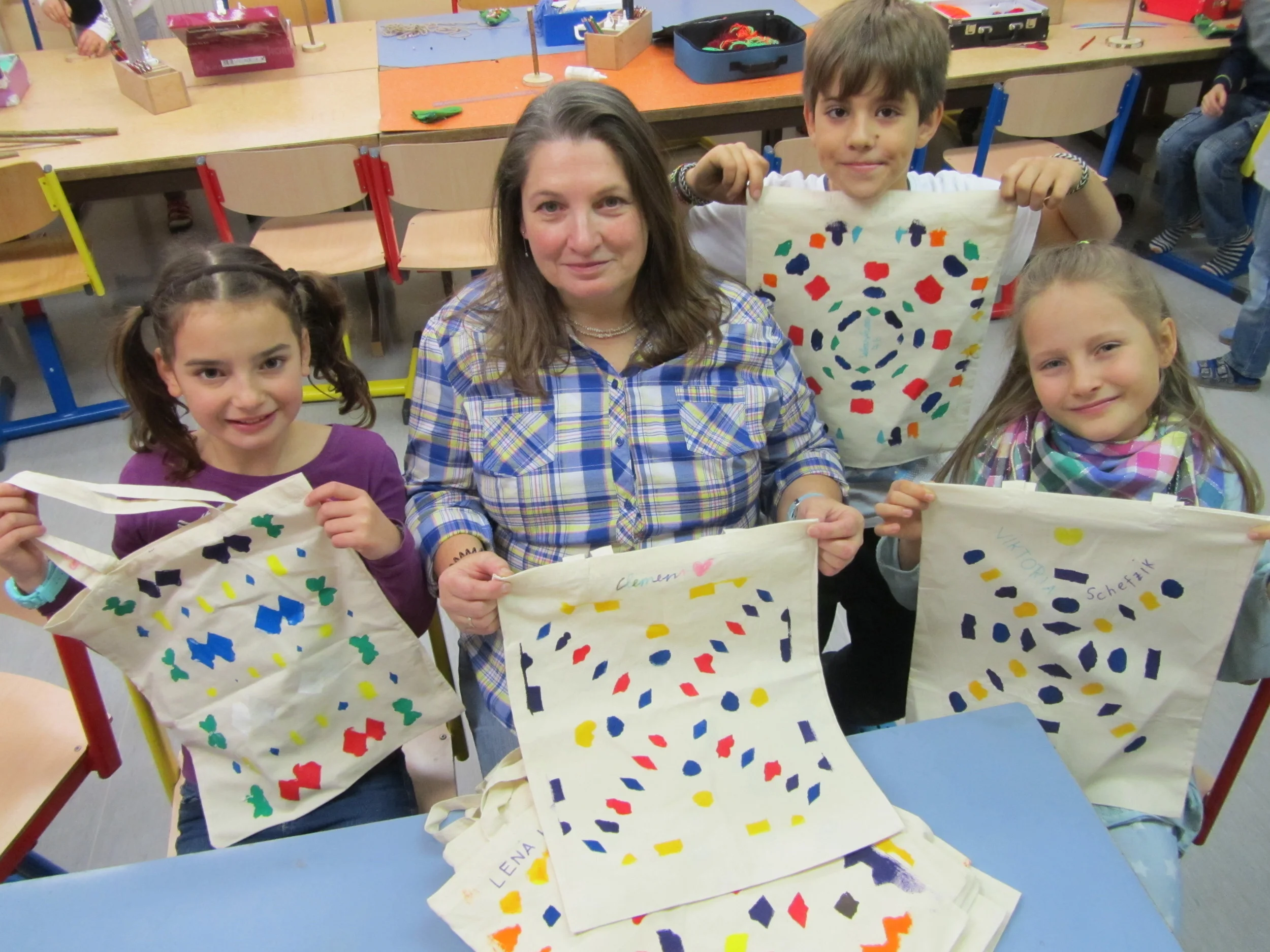 Die Schülerinnen und Schüler der Volksschule Judendorf – Straßengel nahmen am Projekt „Stofftaschen“ teil. Sie werden die Stofftaschen für den Transport von Schulsachen oder Werkstücken verwenden, die nicht in der Schultasche keinen Platz finden. Alle Taschen wurden im Werkunterricht gestaltet. Die ersten Klassen gestalteten ihre Taschen zum Thema "Grundfarben in geraden Linien". Die Grundfarben gelb, rot und blau wurden mit Walzen senkrechte, waagrechten oder diagonalen Linien aufgetragen. Die zweiten Klassen gestalteten ihre Taschen zum Thema "Blumenwiese". Mit Stempeln wurde eine Blumenwiese mit kleinen Tieren gestaltet. Die dritten Klassen gestalteten ihre Taschen zum Thema" Herbstlaub". Die Taschen wurden mit Blättern in herbstlichen Farben bedruckt. Die vierten Klassen gestalteten ihre Taschen zum Thema "Schablonenmalerei". Zuerst wurden Schablonen aus Papier angefertigt und anschließend die freien Ausschnitte mit Stofffarben ausgemalt.