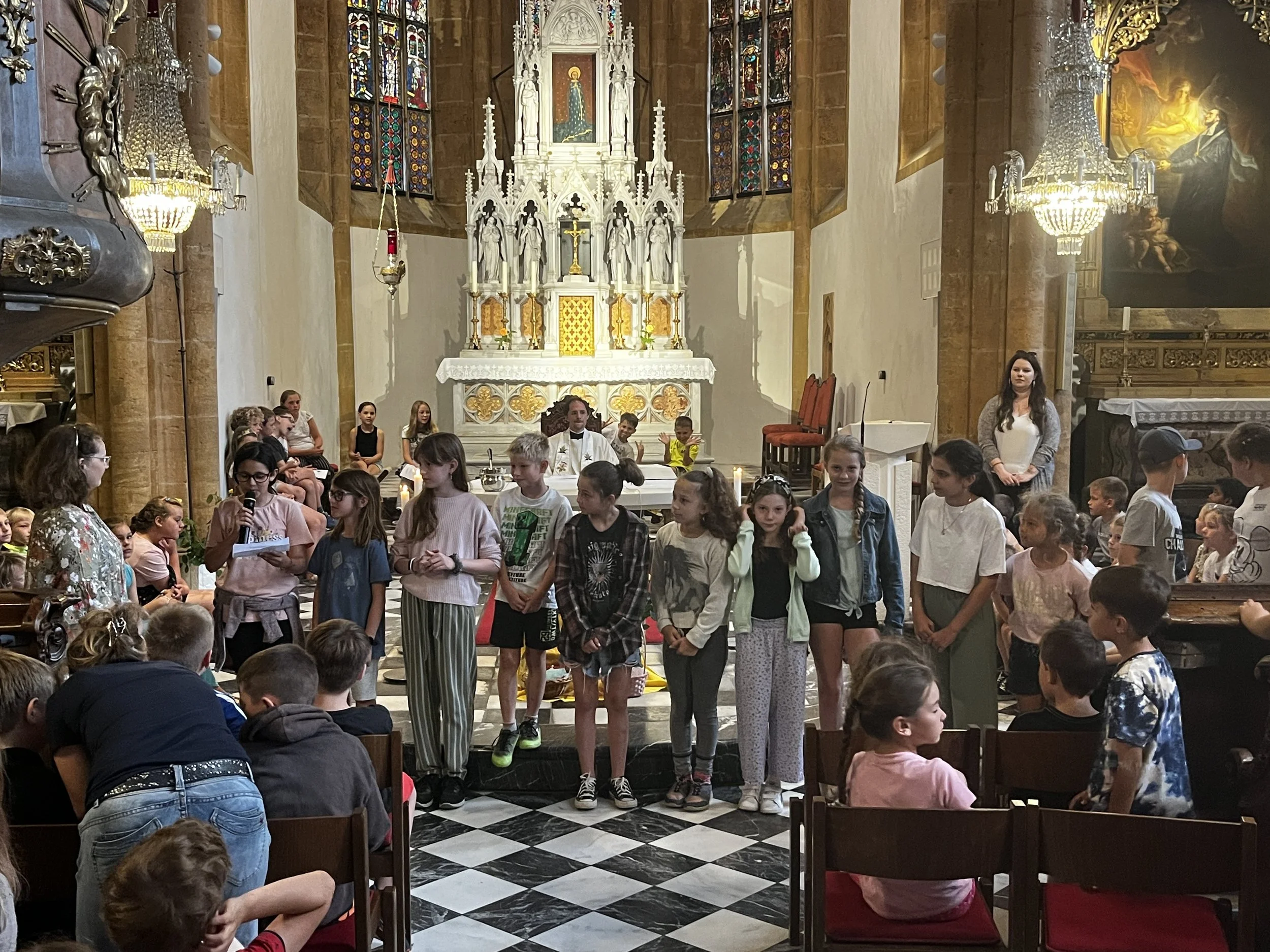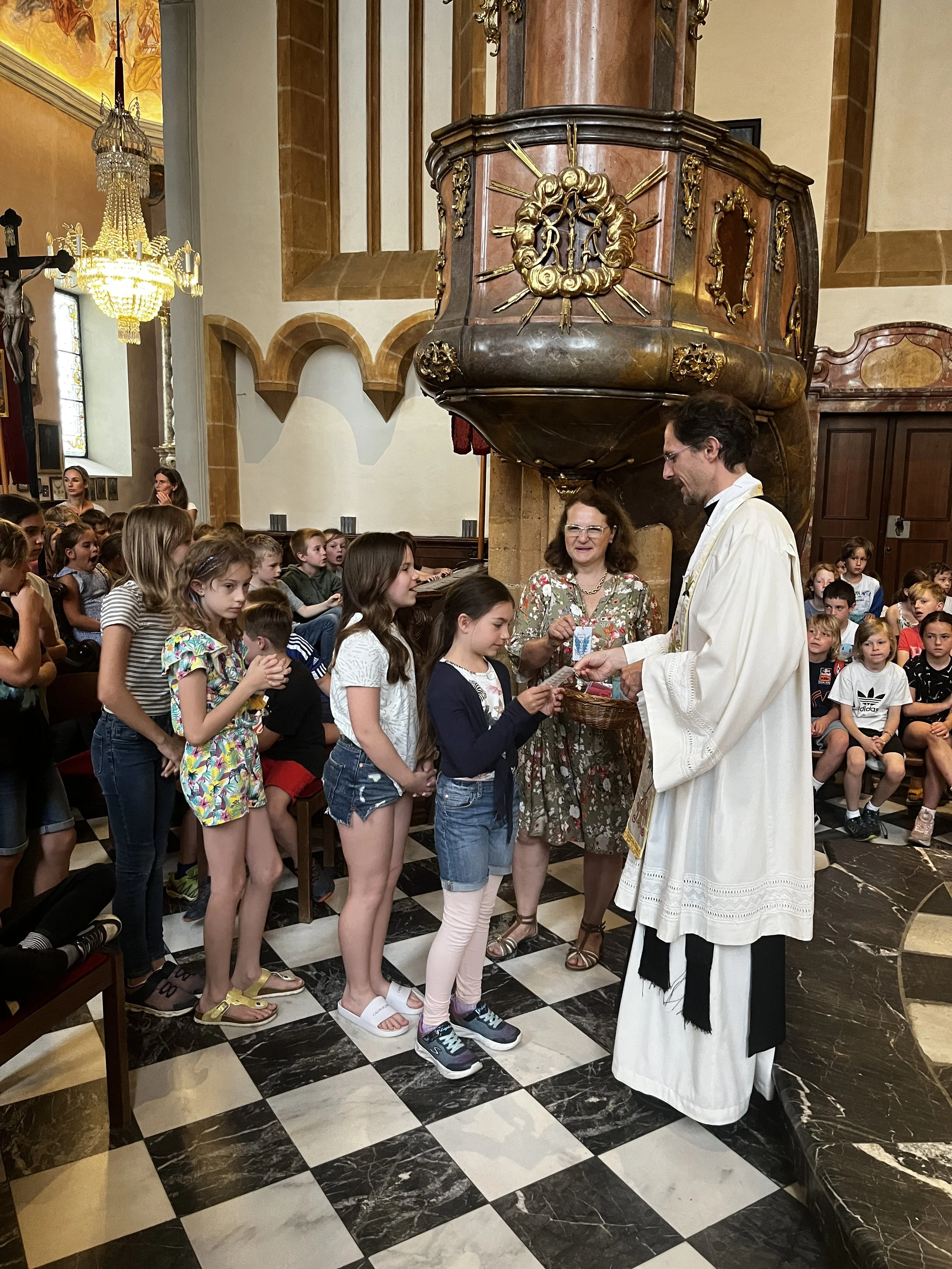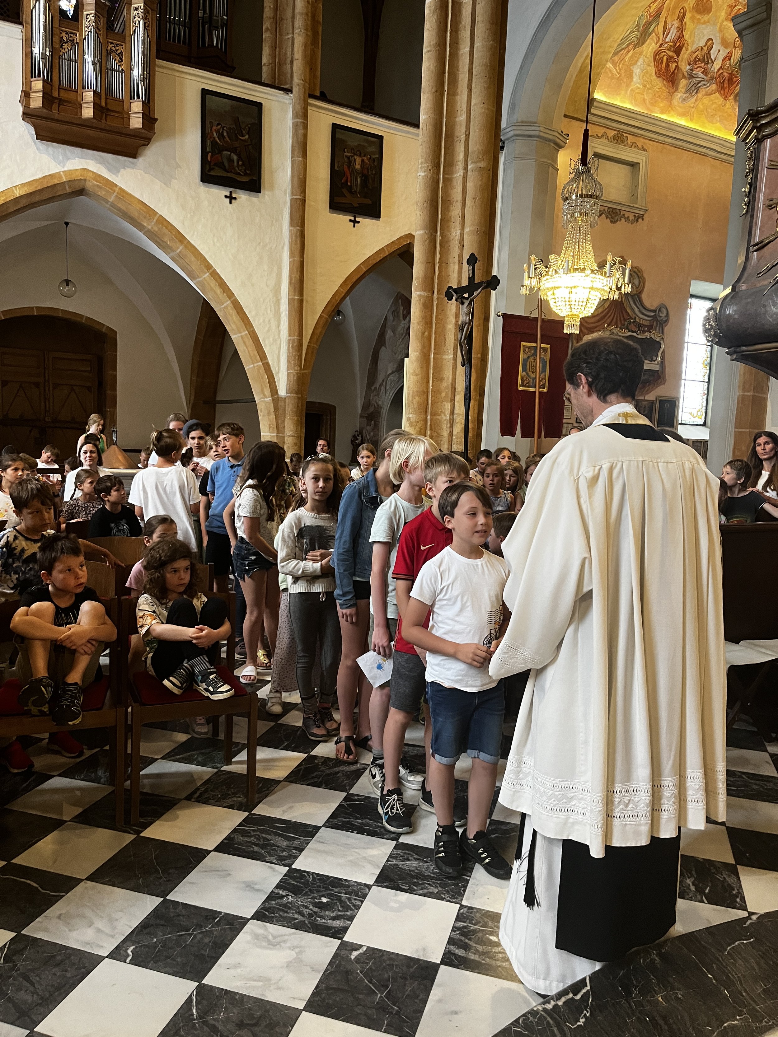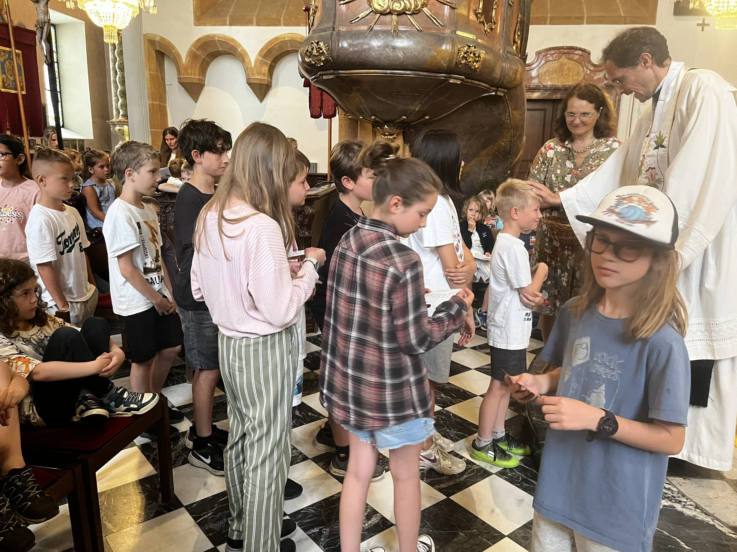 Am 27.6. haben wieder alle Klassen gemeinsam Schulschluss-Gottesdienst gefeiert. Unser Thema war Schutzengel und die 4. Klassen bekamen von Pater Raphael einen Einzelsegen und als Andenken einen Schutzengel-Anhänger. Es war sehr bewegend!