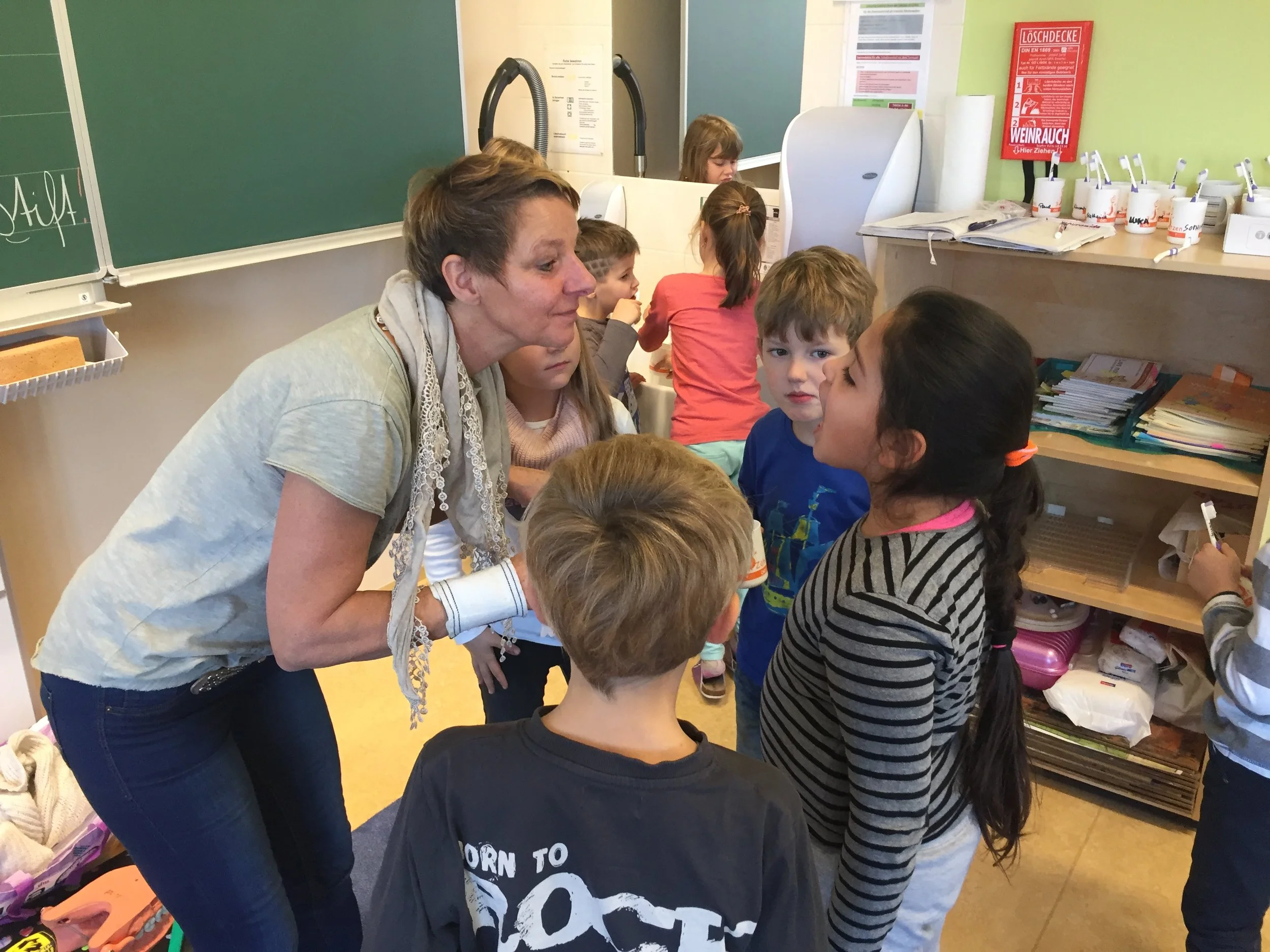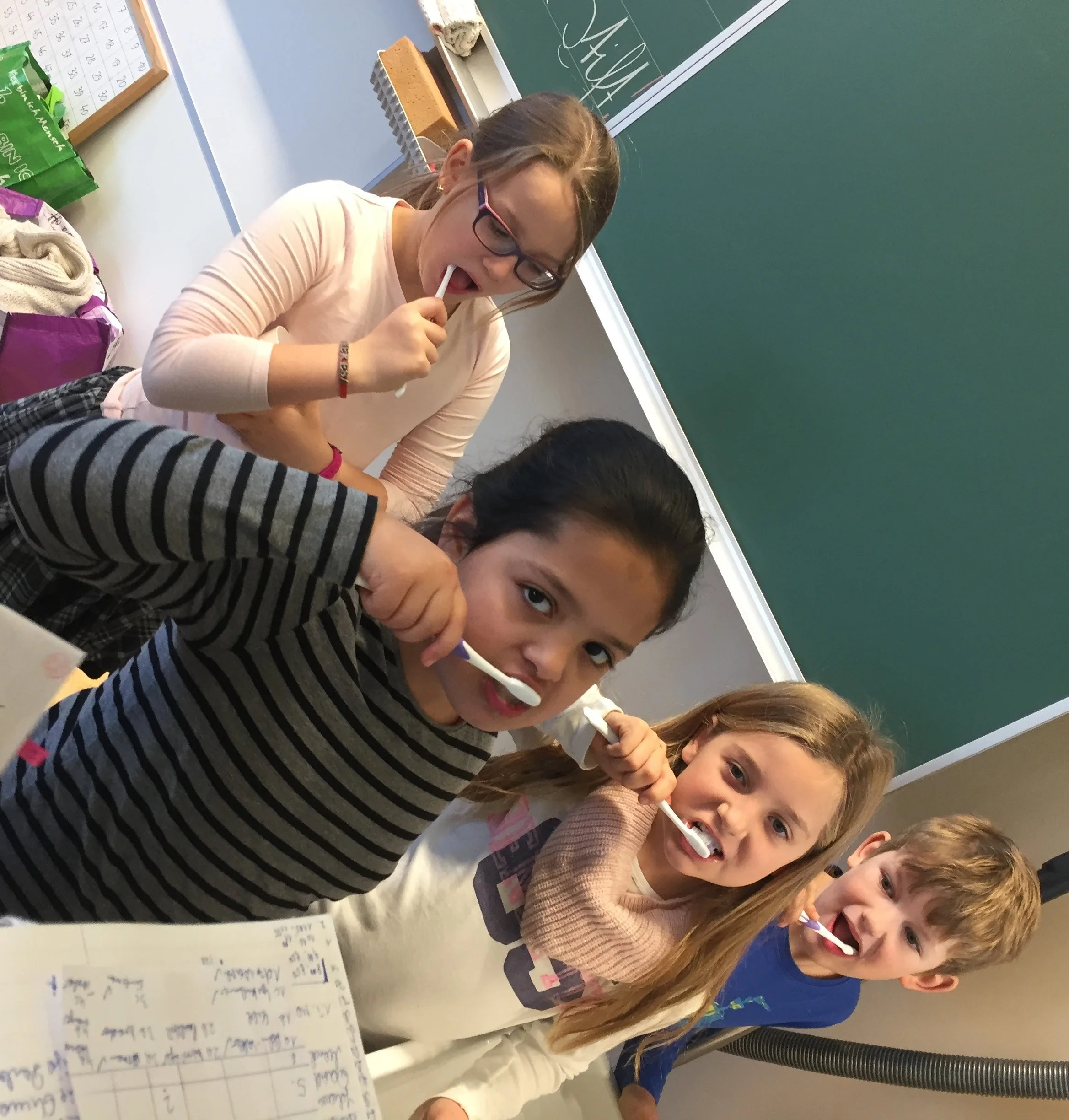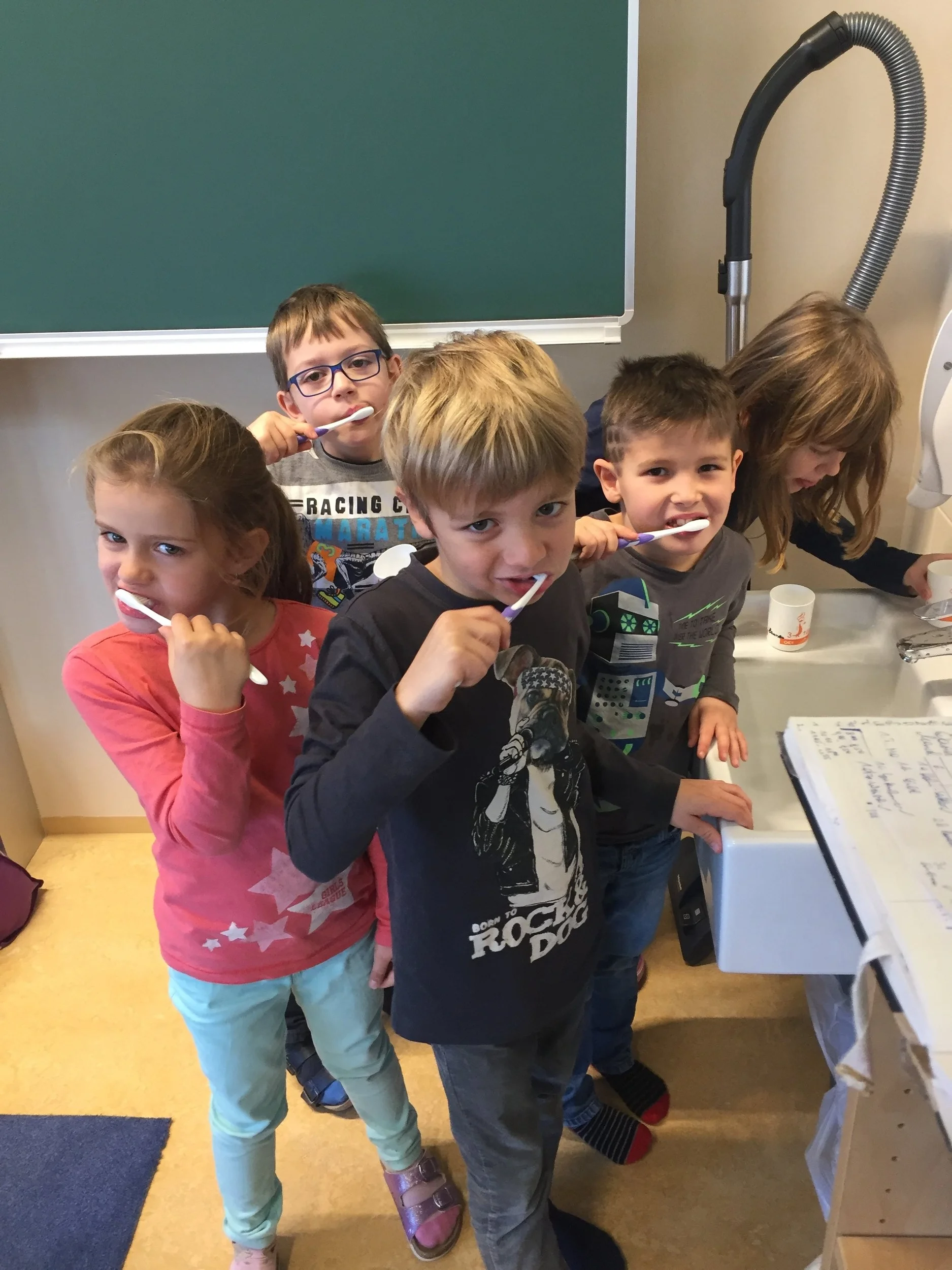 Die Zahngesundheitserzieherin Frau Andrea Jonke (Firma Styria Vitalis) arbeitet mit den Kindern zum Thema Zahnhygiene. Auf das richtige Putzen der Zähne wird dabei besonders viel Wert gelegt.