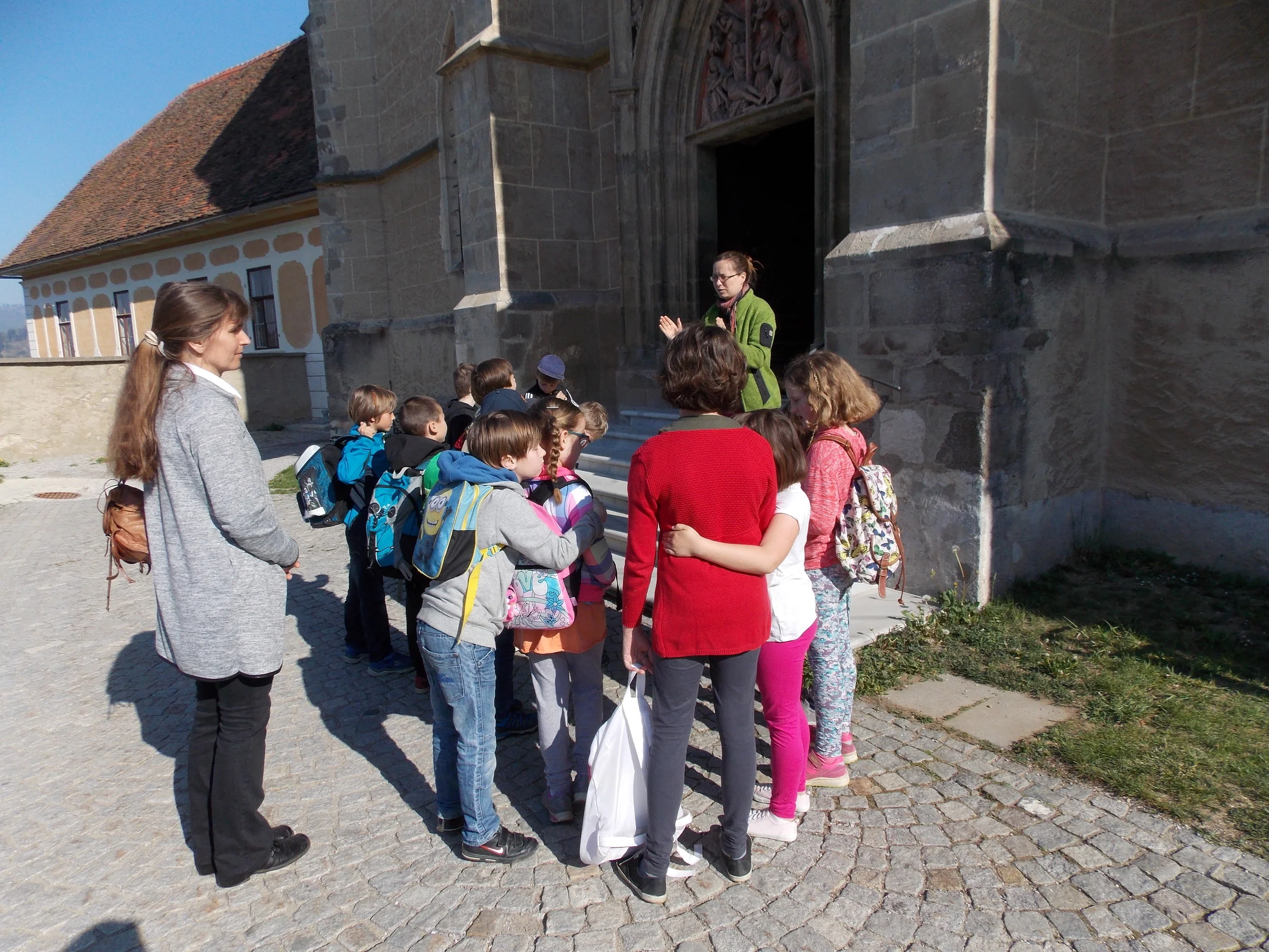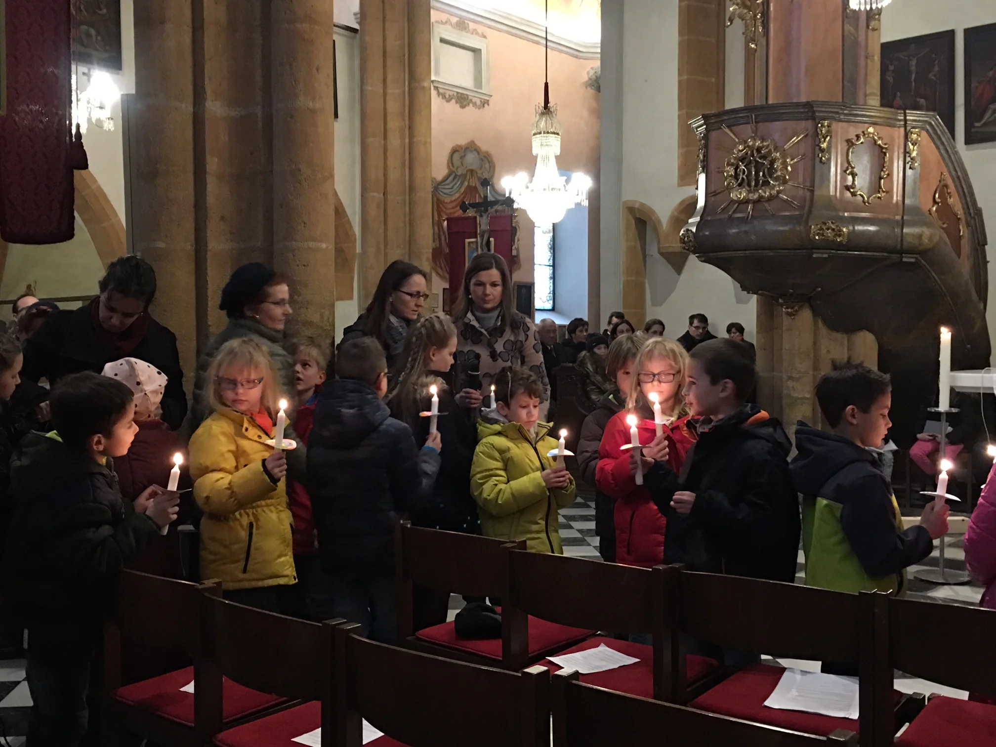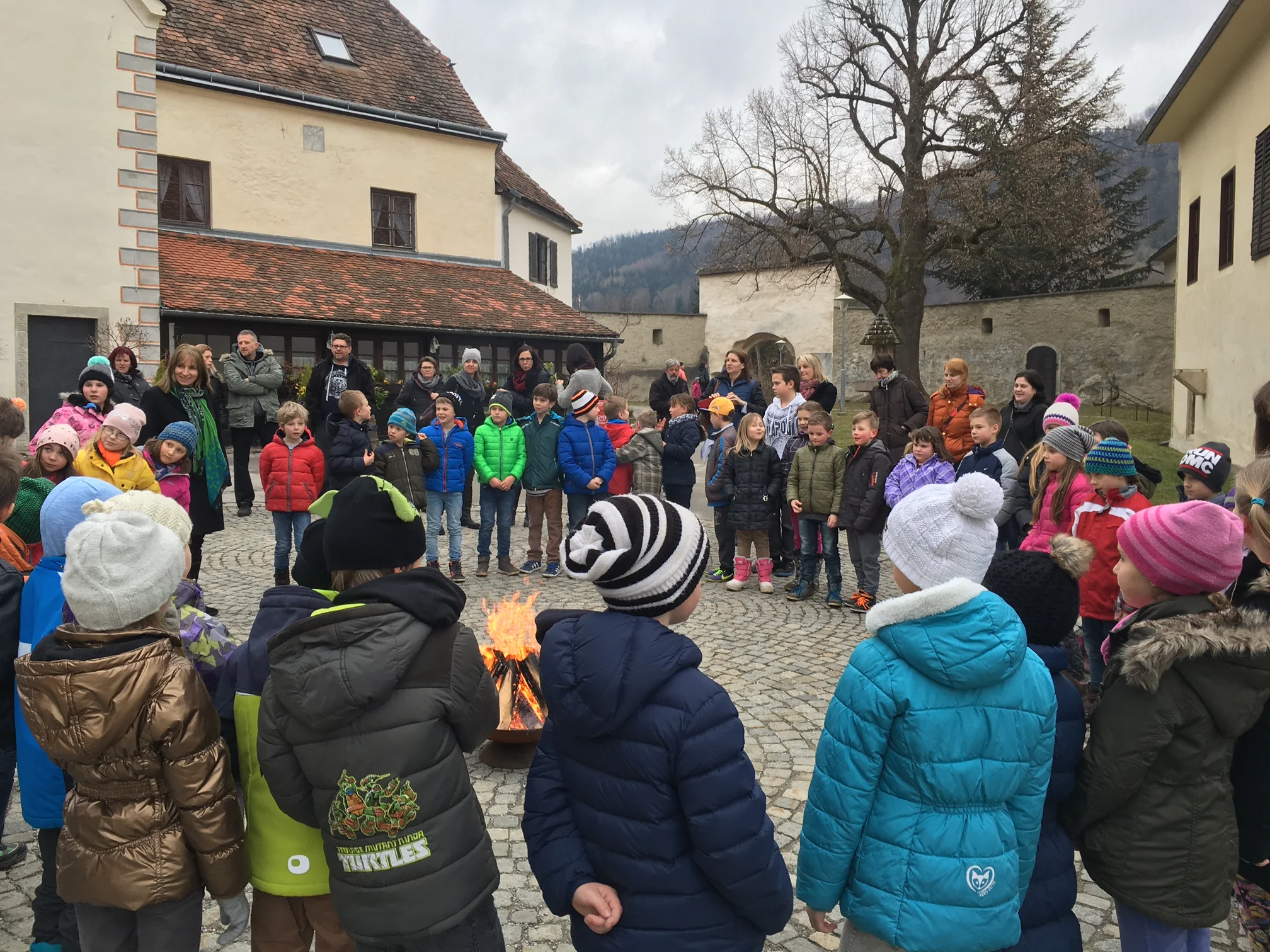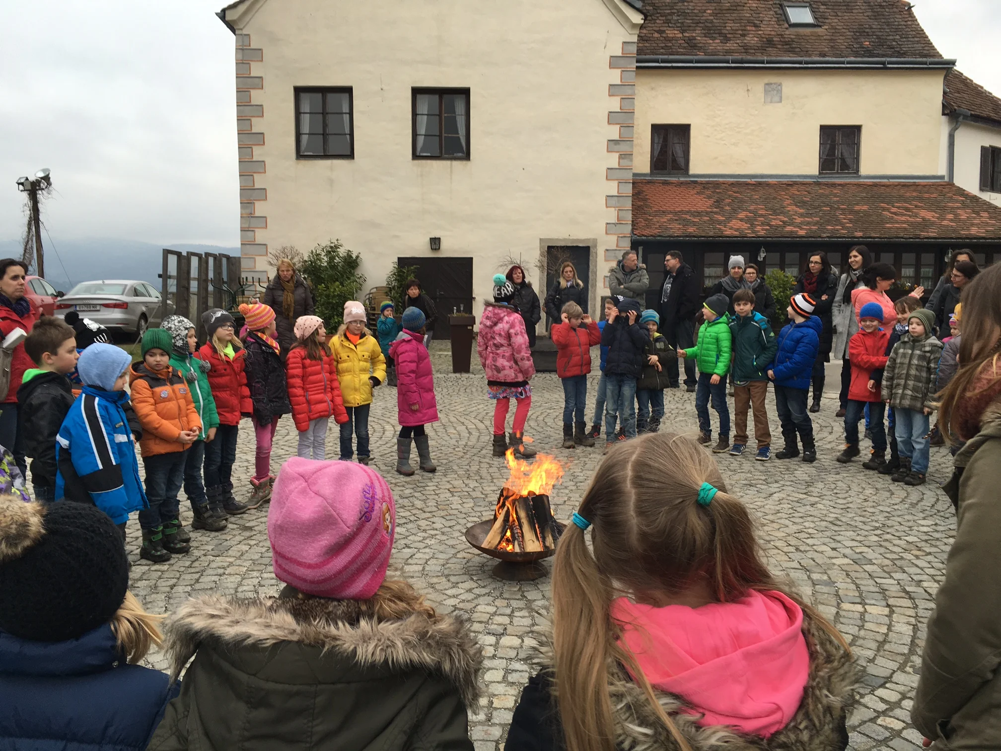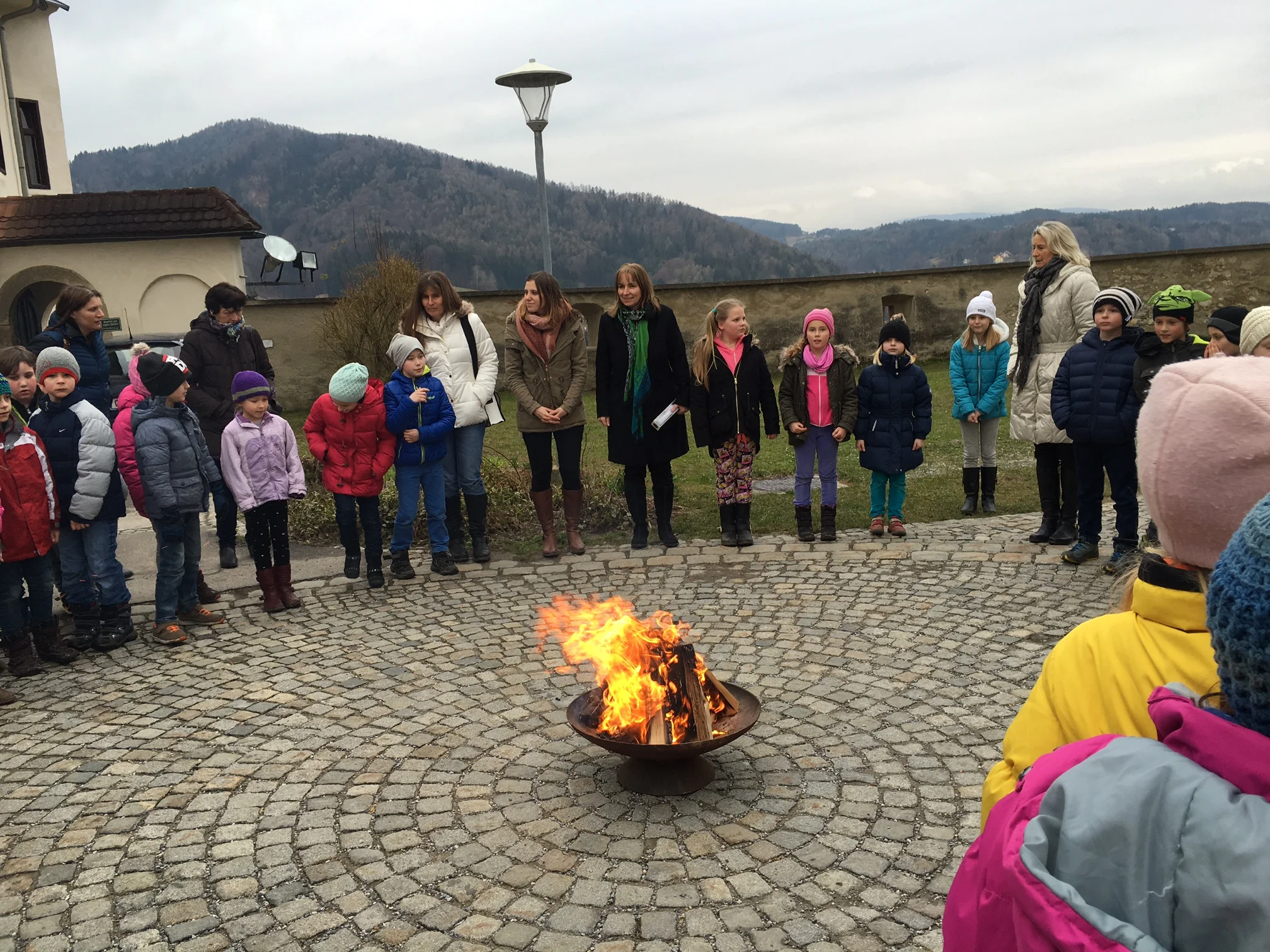 Gemeinsam unterwegs, so gehen wir dem Fest entgegen, die Kinder mit den Eltern, die Tischmuttis und die Lehrer/innen der VS.